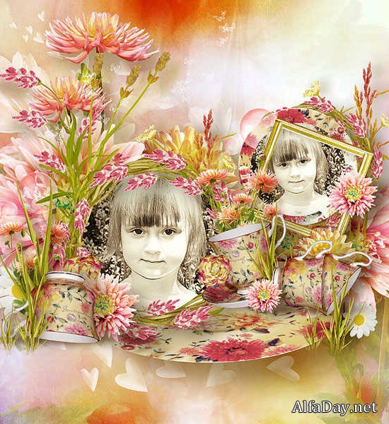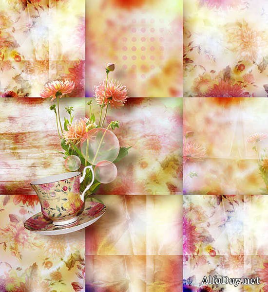 Красочные романтичные кластеры, яркие летние цветы из садов и полей, фарфоровые чашки с блюдцами расписанные узорами, огранённый алмаз, фоны с пёстрой расцветкой