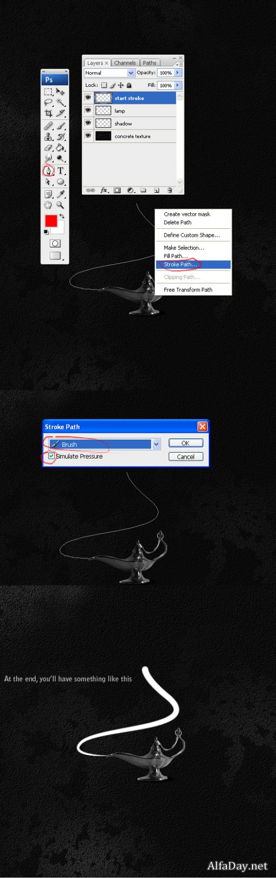 Выделите слой "начало огня", захватите инструмент "Перо" ("Pen Tool"), просто кликните и выберите "Выполнить обводку контура"