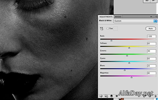 Если испытываете затруднения, видя то, что требует осветления или затемнения, откройте Черный и Белый слой настройки (Black & White Adjustment Layer) и подвиньте Красный так, чтобы добавить контраст.
