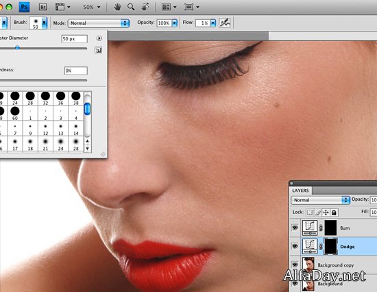 готовы перейти к следующему шагу, тогда этот урок для вас.Вы возможно знаете, что инструменты Осветление (Dodge) и Обжиг (Burn) изменяют локальное воздействие, осветляя или затемняя ваше изображение в мазках кисти. При помощи Осветления (Dodge) и Обжига (Burn) мы переходим к гладкой и совершенной коже, оставляя текстуры неповрежденной, что особенно важно в профессиональной работе.