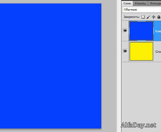 Для понимания понятия маски в фотошопе, представим себе обычную карнавальную маску. Ее задача скрыть под собой лицо. Так и в Photoshop маска скрывает под собой слои лежащие ниже и показывает слой к которому она применена. Чтобы было более наглядно откроем фотошоп и создадим файл с двумя слоями: нижний зальем желтым цветом, а верхний синим. К верхнему слою применим маску, для этого заходим в меню «Layer» («Слой«), выбираем «Layer Mask» («Маска слоя«) и «Reveal All» («Показать все«). В палитре слоев справа около верхнего слоя появился белый прямоугольник, это и есть маска.