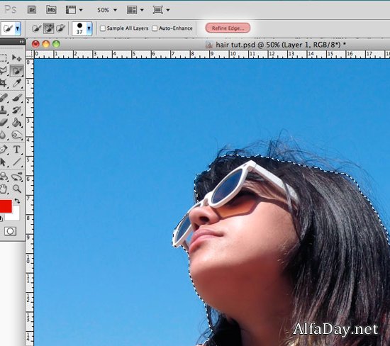 Используем Quick Selection Tool (Быстрое выделение), чтобы выделить девушку в общем. Устанавливаем размер кисти 37 px и жесткость 100%. Обводим контур девушки, чтобы создать быстрое выделение.