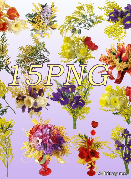Клипарт для фотошопа PNG к 8 Марта - Весенние цветы, букеты с мимозой Mimosa Bouquets Spring Flowers on 8 March 15 PNG | 2888 x 3200 | 300 dpi | 101,67 Мб