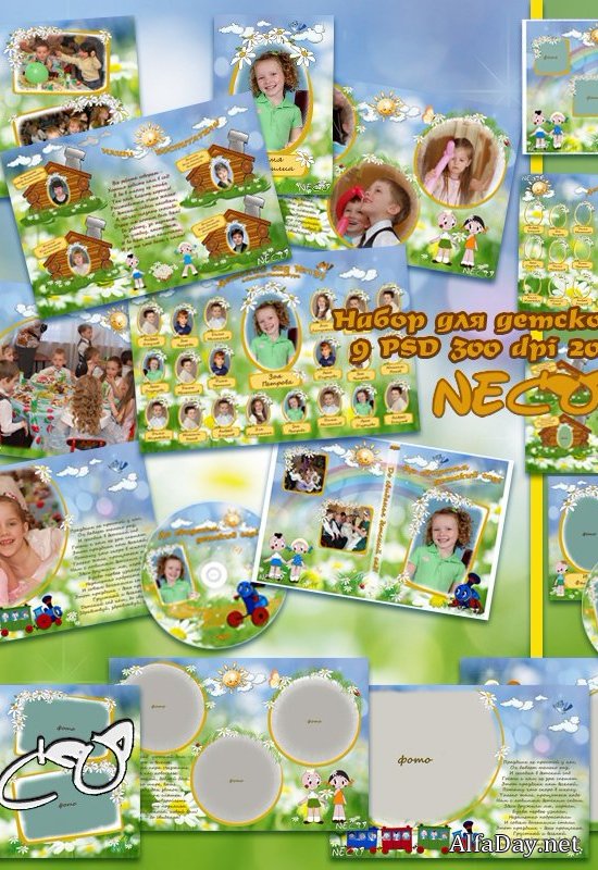 Виньетки и шаблоны для детского сада в формате PSD По мотивам мультфильма "Паровозик из Ромашково" PSD, многослойный, слои отключены | Шрифты прилагаются | 300 dpi | 300 dpi | 264 MB 9 шаблонов: бокс, диск, виньетки, рамки Шаблон для оформления диска и бокса 1406х1406 и 3272х2209 Шаблоны рамок и виньеток 3543х2362 (20х30см) Автор: Neco