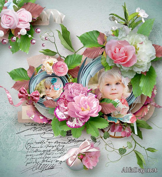 розовые розы, ромашки, голубые ирисы, колочкольчики, розовые пионы, плюшевый розовый медвеженок, молочник с цветочным декором, жемчужинка, белый скворечник, банты, круглые рамки из ленточек, зеленые листочки, старый ключ, пастельные фоны